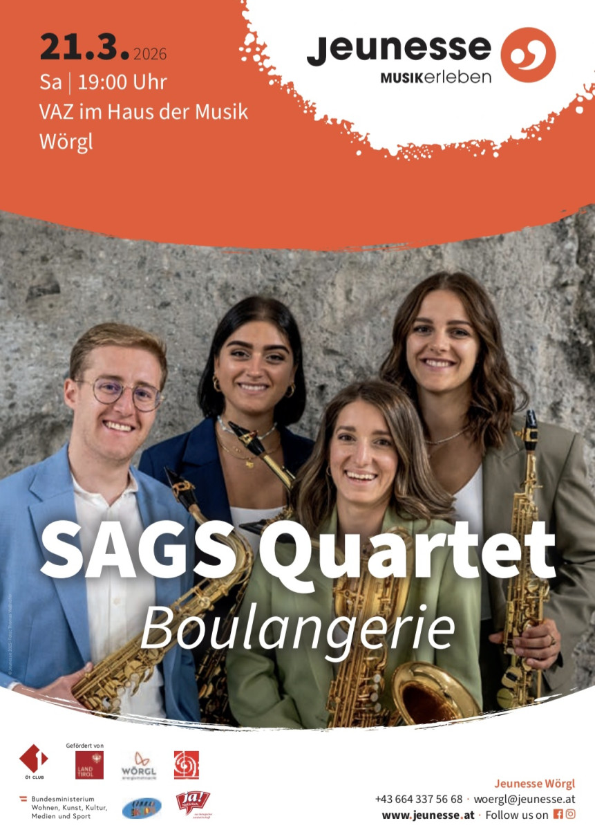 Am Samstag, 21. März 2026, findet um 19:00 Uhr im VAZ im Haus der Musik Wörgl ein JEUNESSE-Konzert unter dem Titel "Boulangerie" mit dem SAGS Quartet statt. Die aus Südtirol stammenden Musiker:innen Sonja Wallnöfer (Sopransaxophon), Greta Franzelin (Altsaxophon), Alex Designori (Tenorsaxophon) und So...nja Oberkofler (Baritonsaxophon) absolvierten die musikalische Ausbildung an verschiedenen Orten in Österreich, der Schweiz und den Niederlanden und haben sich seit ihrem Debüt im Brucknerhaus Linz einen hervorragenden Ruf erarbeitet.