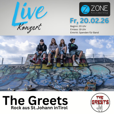|  | | Livekonzert mit "The Greets" Fr, 20.02.2026, 20:00 | Zone - Kultur.Leben.Wörgl, Wörgl Veranstaltet von Zone - Kultur.Leben.Wörgl