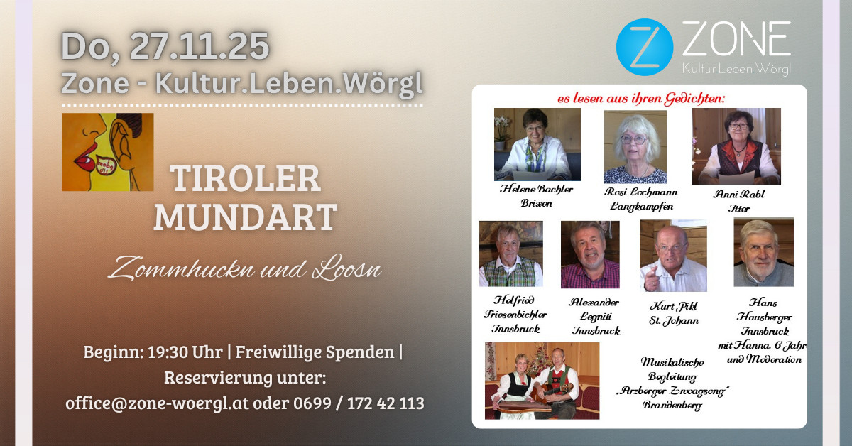 |  | | Tiroler Mundart - Zommhuckn und Loosn Do, 27.11.2025, 19:00 | Zone - Kultur.Leben.Wörgl, Wörgl Veranstaltet von Zone - Kultur.Leben.Wörgl