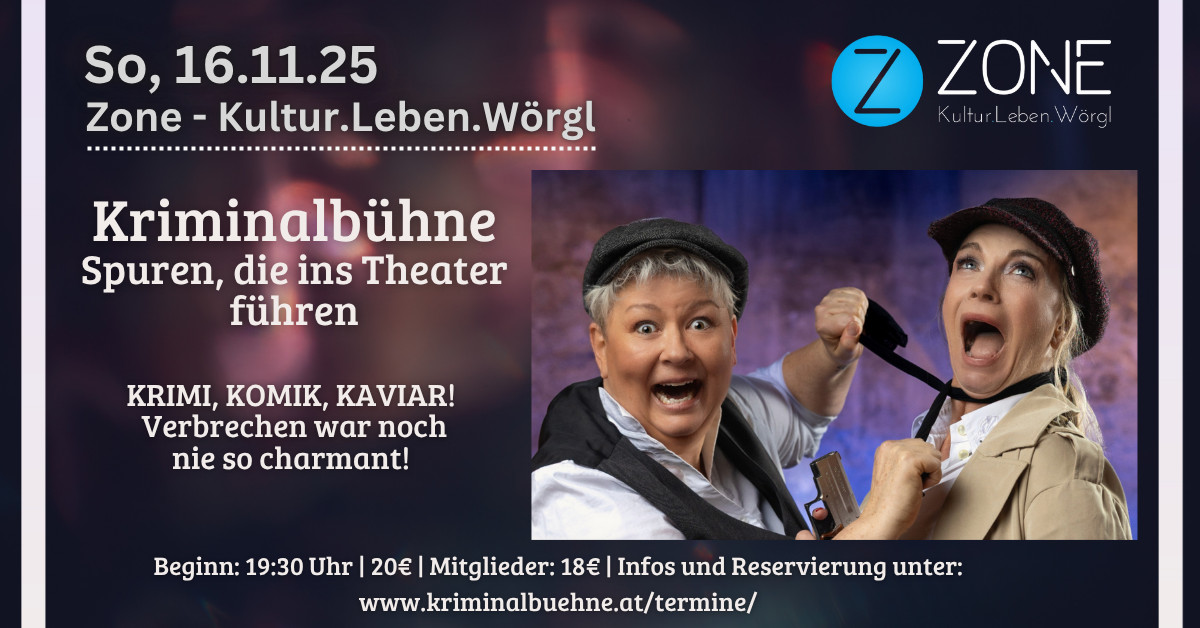 |  | | Kriminalbühne - Spuren die ins Theater führen Sa, 15.11.2025, 19:30 | Zone - Kultur.Leben.Wörgl, Wörgl Veranstaltet von Zone - Kultur.Leben.Wörgl