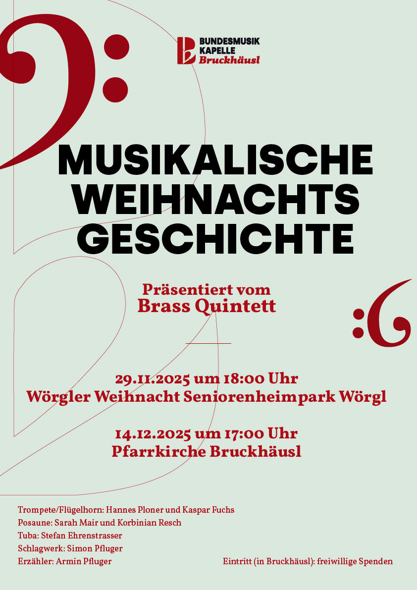 |  | | Musikalische Weihnachtsgeschichte So, 14.12.2025, 17:00 | Pfarrkirche Bruckhäusl, Kirchbichl Veranstaltet von Bundesmusikkapelle Bruckhäusl